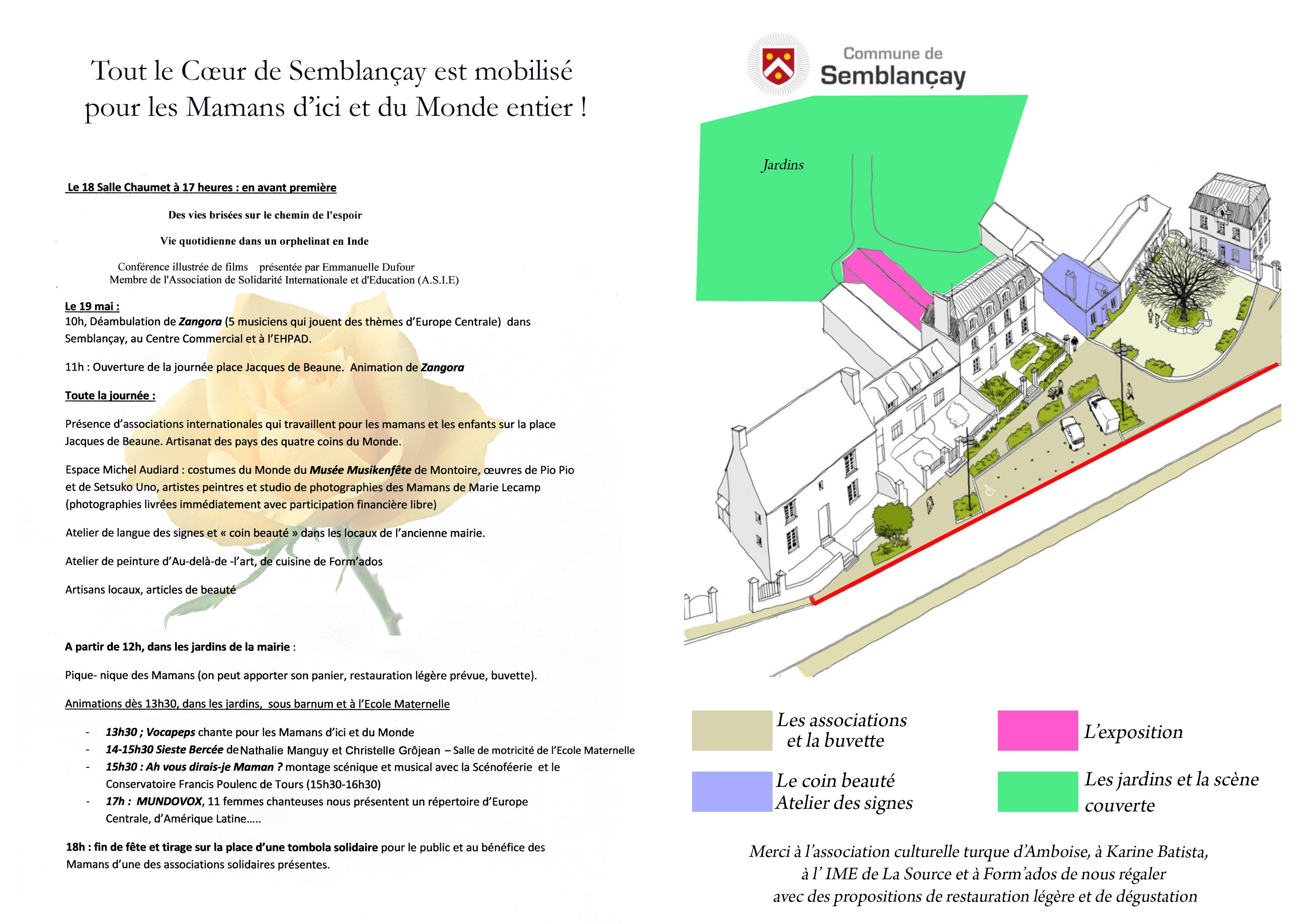 Festif et sous le signe du partage, ce rassemblement permettra notamment de visiter l'exposition de costumes du Monde du Musée Musikenfête de Montoire , des peintres Pio Pio et Setsuko Uno et de la photographe Marie Lecamp , d'entendre des groupes musicaux de qualité (Zangora, La Sieste Bercée, MUNDOVOX… accompagnés par la chorale de Semblançay Vocapeps qui chantera pour les Mamans) et d'assister à une première collaboration du Conservatoire à Rayonnement Régional Francis Poulenc de Tours et de la Scénoféerie de Semblançay, qui fête cette année ses trente ans. Sans oublier le plaisir de savoureuses dégustations lors du pique nique des mamans organisé dans les jardins de la Mairie.