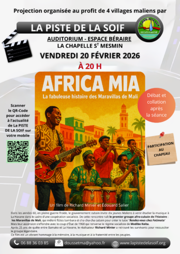 L’association La Piste de la Soif organise une projection du film “Africa Mia” qui sera suivie d’un débât et d’une collation. Cette projection est organisée le vendredi 20 février à 20h à l’Espace Beraire à La Chapelle Saint-Mesmin.